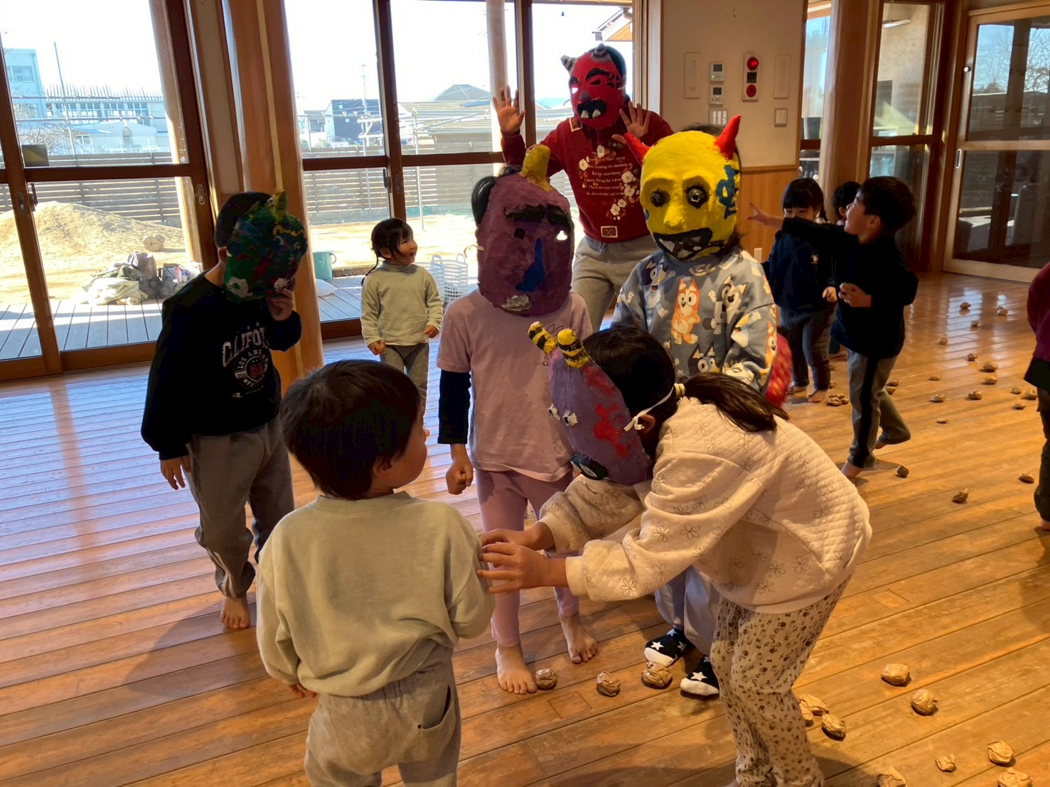 【写真は保護者の同意を得た上で掲載しています】 2026年2月3日は節分 年長さんはこの日のために、時間をかけて作った張子のお面をかぶり、まずは小さい子たちの元へ… おにはーそと! ふ…