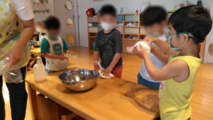 説明を聞いた後は、みんなで協力しながらまずは粉をボールに入れて…