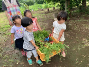 今日は年中空組さんが、にんじんの収穫🥕です。たくさん採れたよー!みんなで運ぼう!