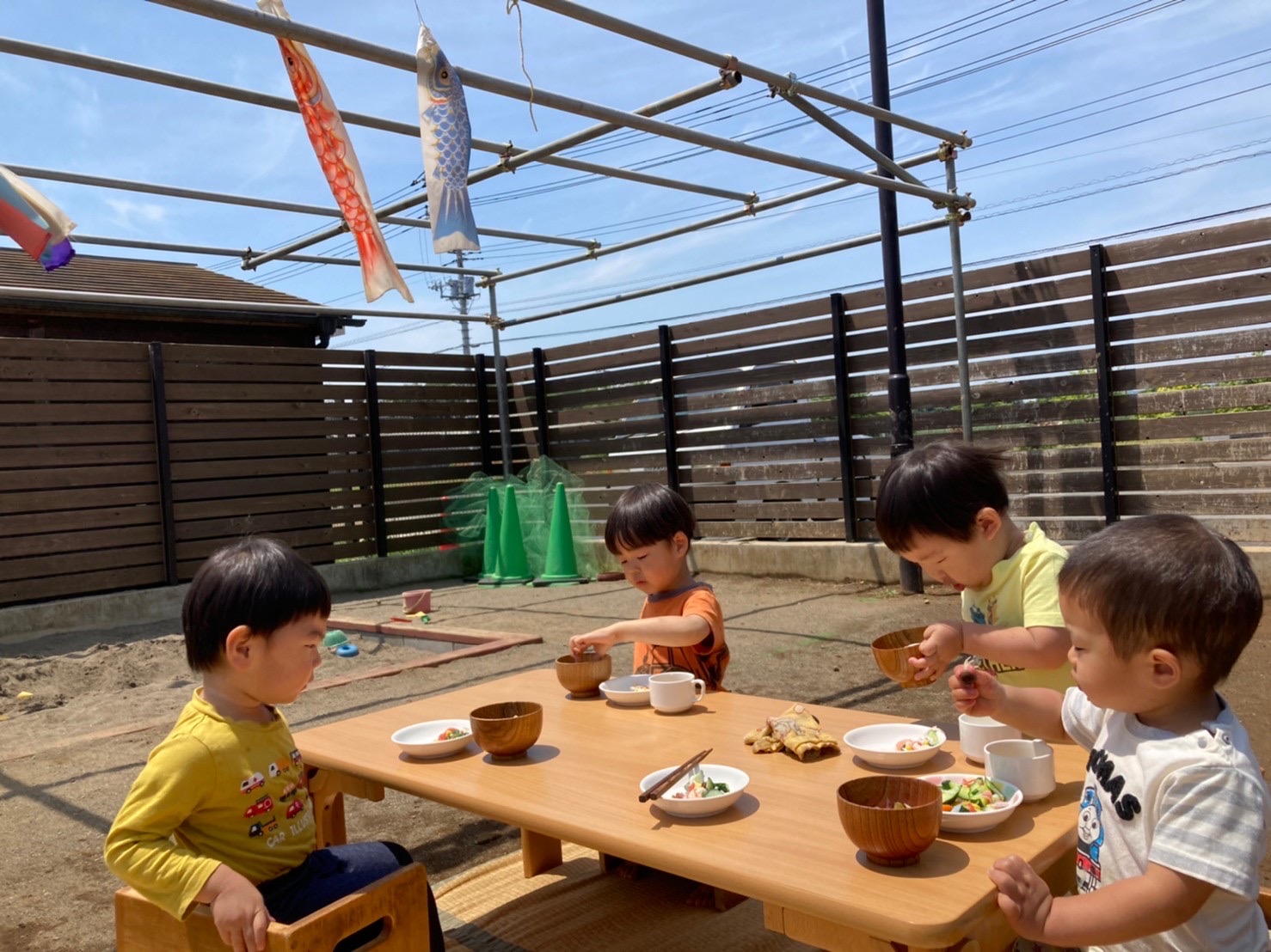 園庭に泳ぐこいのぼりを見ながら食べるクラスも…!