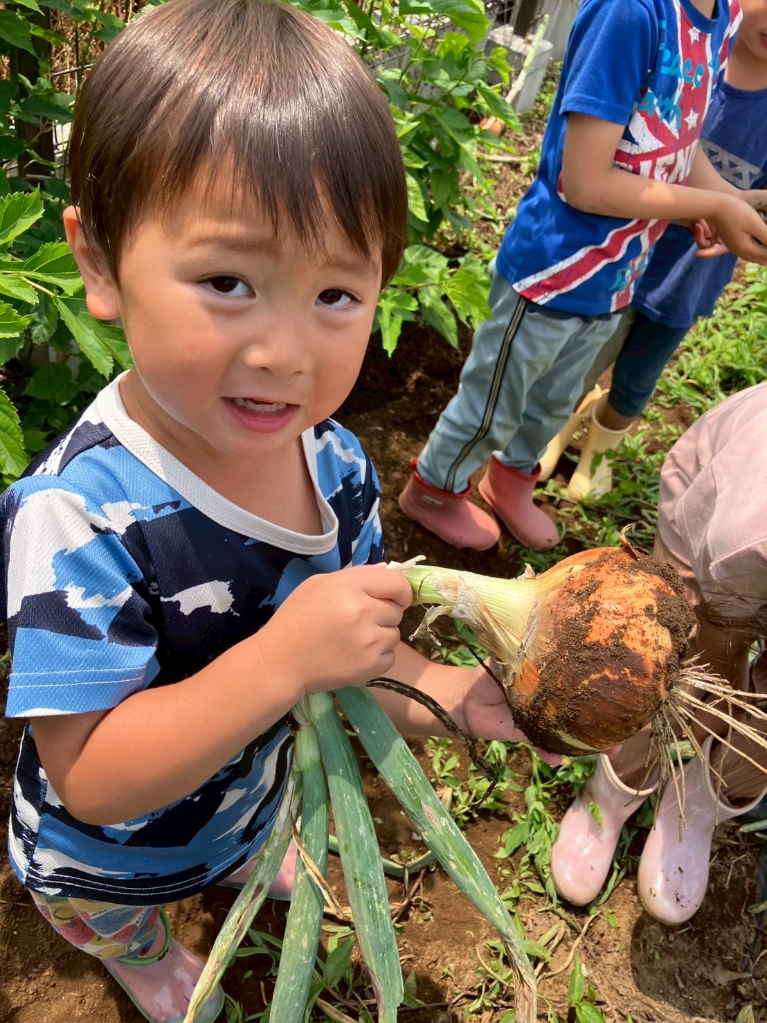 【写真は保護者の同意を得た上で掲載しています】 今年も玉ねぎが収穫時期を迎え、 3・4・5歳児の子どもたちが収穫をしました。 年長さんは、採れたてを調理して味見しましたよ! 甘くて美味…