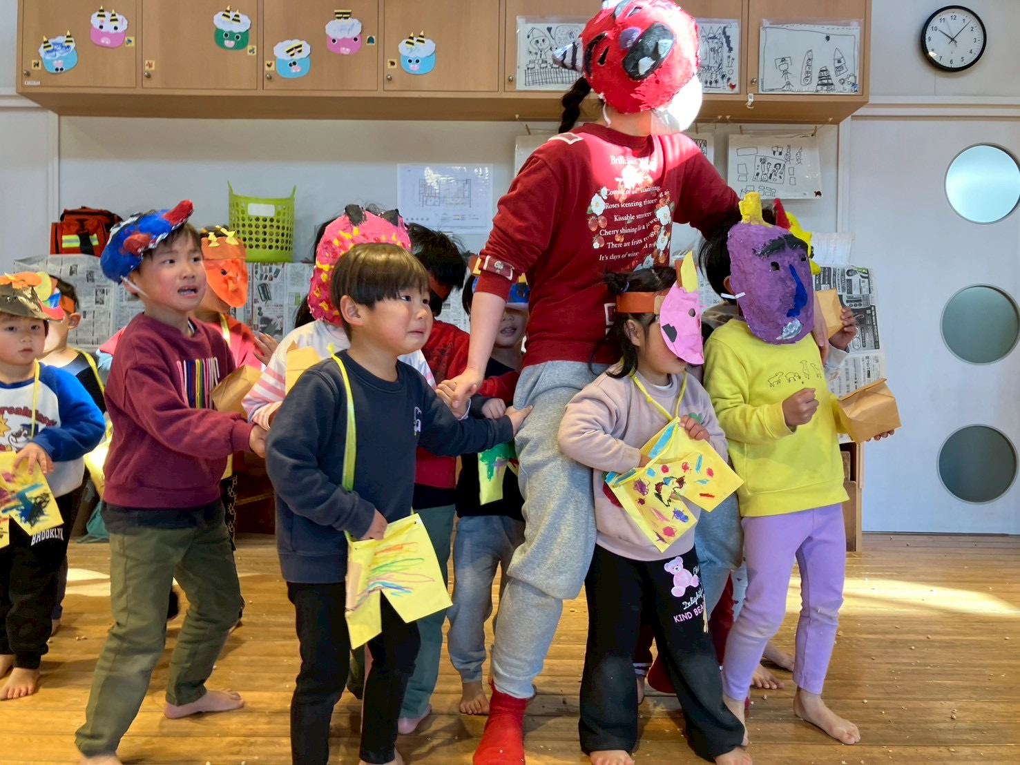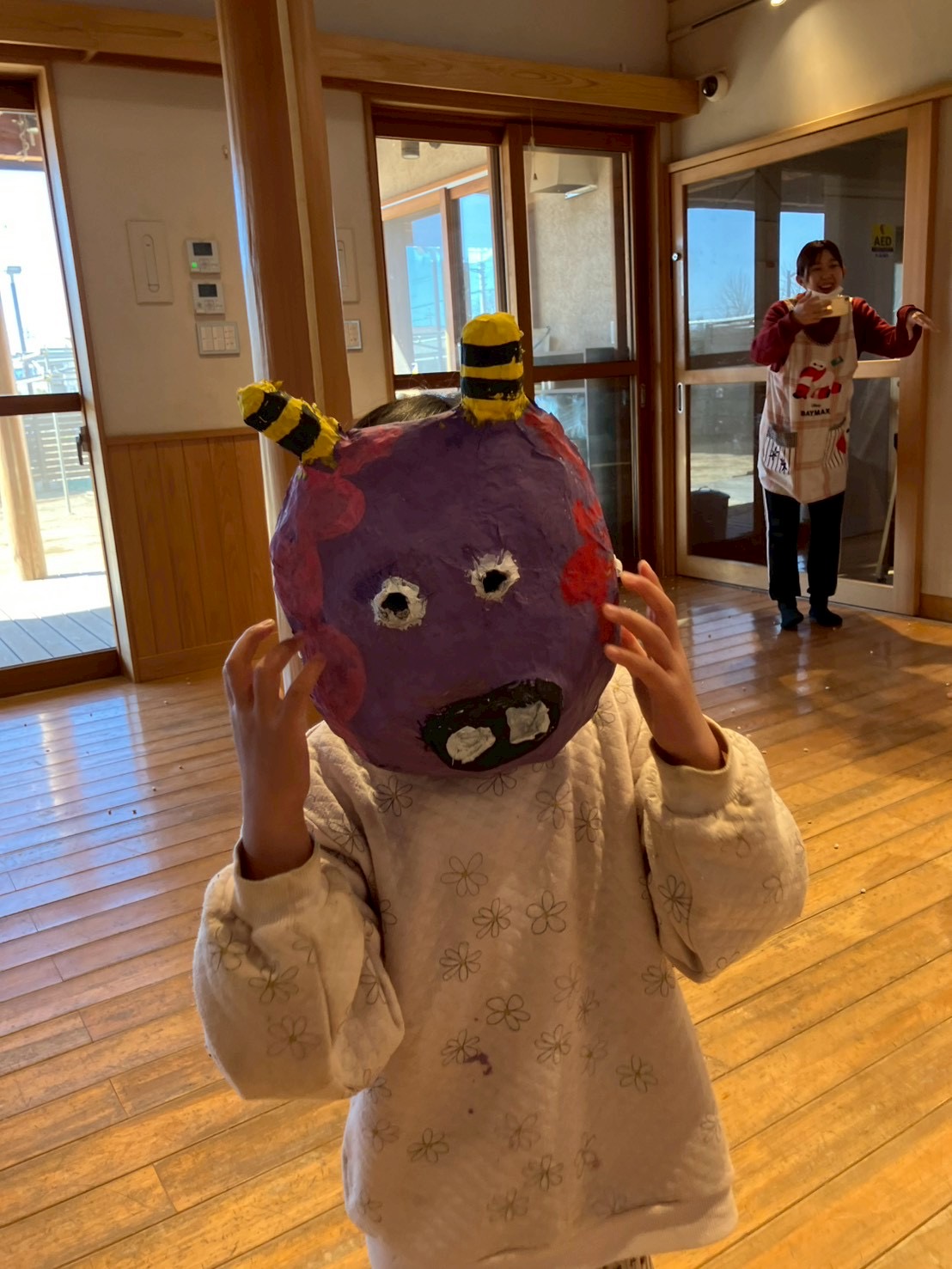 あまりに泣くので、お面をとって顔を見せてくれる優しい年長さんなのでした☺️
