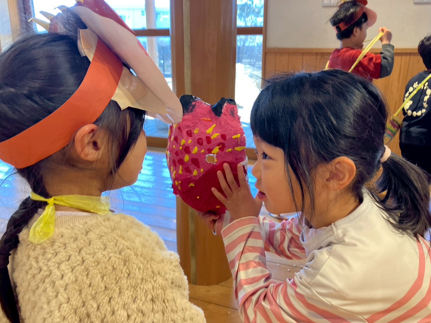 年長さんはこの日のために、時間をかけて作った張子のお面をかぶり、まずは小さい子たちの元へ…