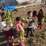 1月11日 園庭にて おもちつき会 をしました💓 朝、2.3歳クラスは大根抜きに挑戦! う〜んと踏ん張って抜いた大根は、大根おろしにしてお餅につけて…