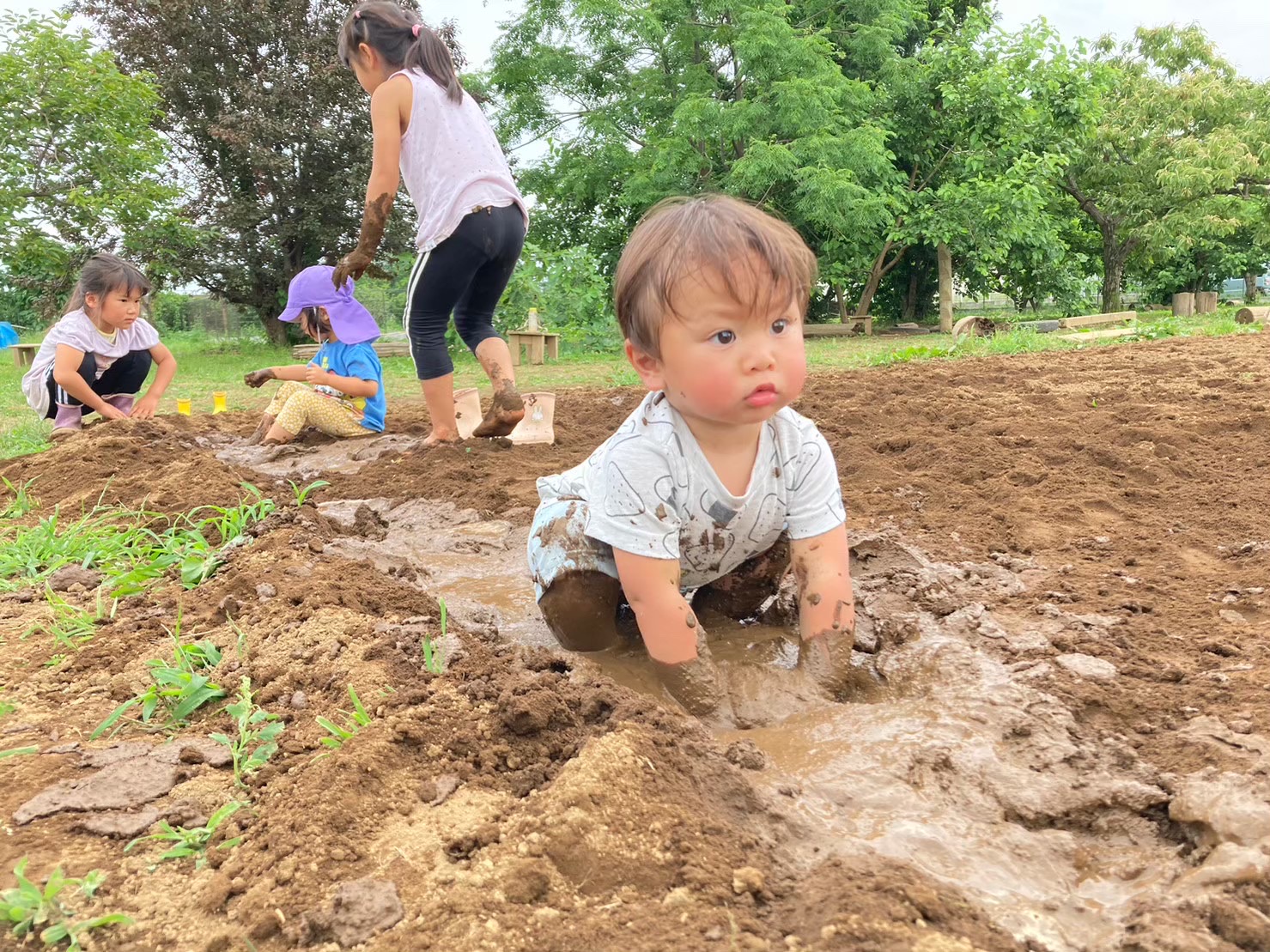どろんこ遊び schedule 2023年7月20日 Yせんせい日々のようすにこにこ記録 【写真は保護者の同意を得た上で掲載しています】 農園のふかふかの土に水を流してどろんこ遊び。 とろとろの泥の感覚を全身で感じている子どもたち。 ごはんの時間になっても、まだまだどろんこ海にいたいくらい心地がいいみたい☺️ とことん遊びこむことも、もれあ保育園では大事にしています。