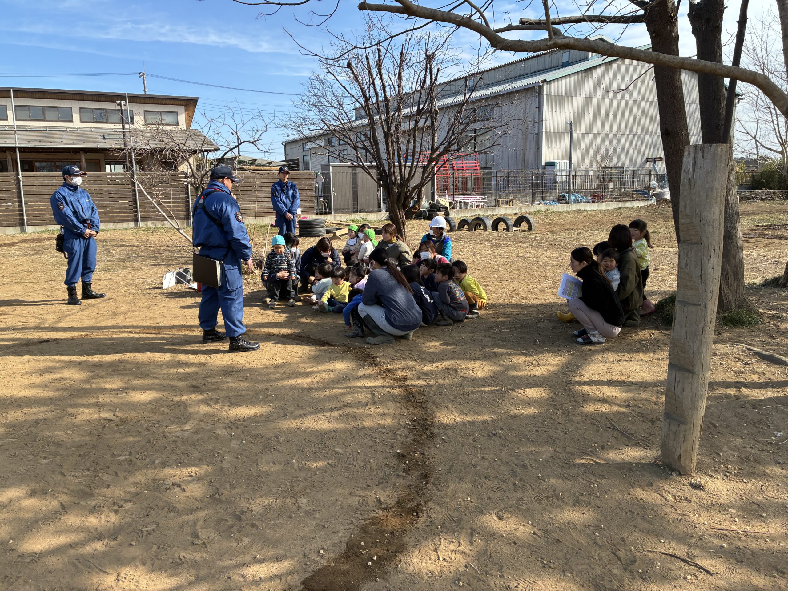 【写真は保護者の同意を得た上で掲載しています】 消防署に立ち合っていただき「避難訓練」を行いました。 非常ベルと「火事だー!!」の声を合図に、園庭で遊んでいた子どもたちは、スムーズに農園に避難。 人数確認と11…
