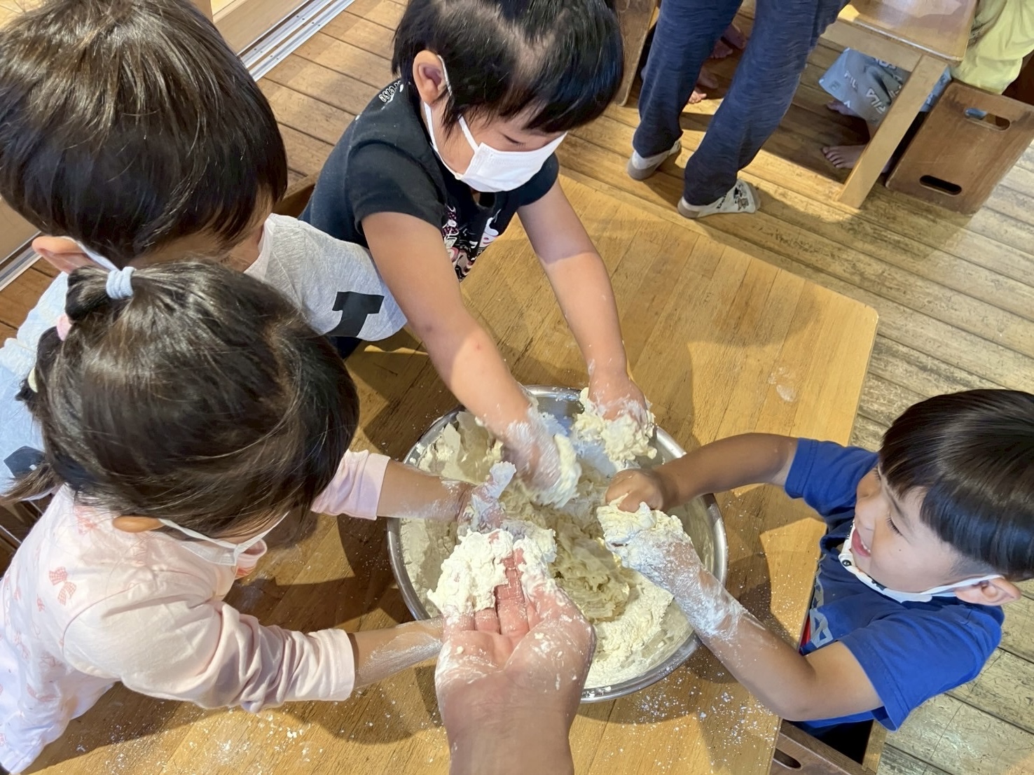【写真は保護者の同意を得た上で掲載しています】 6月の食育は、うどん作り! 小麦粉に水を入れお塩を入れ、 コネコネするところからスタート! さらさらしていた粉たちがまとまってきて、 ねんどみたー…