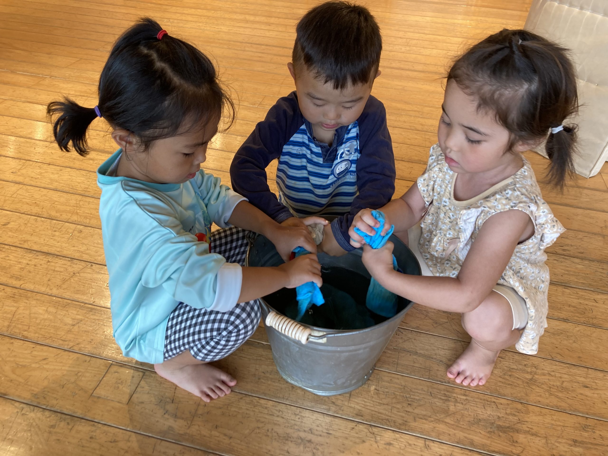 【写真は保護者の同意を得た上で掲載しています】 もれあの朝は年長さんを中心に雑巾掛けから始まります。 このごろは、星組(4歳児)空組(3歳児)も年長さんの姿を真似て、楽しみながらがんばっていますよ✨ …